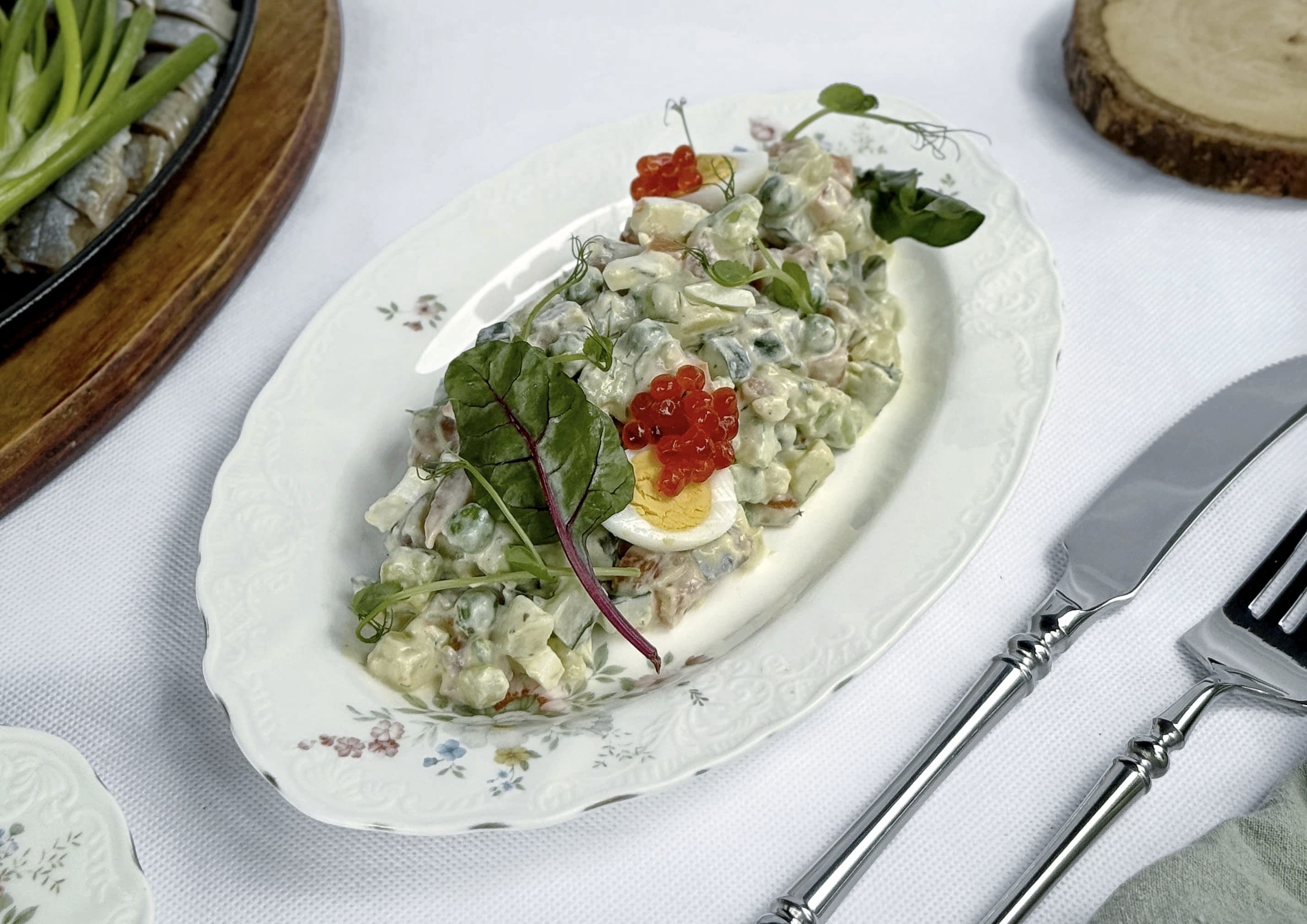 Відварена яловичина, картопля, морква, солоний огірок, яйце, зелений горошок. Заправка: майонез зі сметаною.